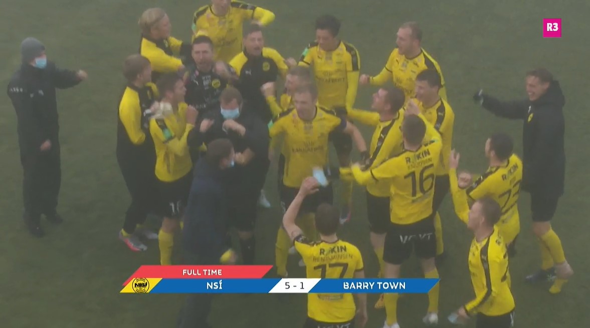 NSÍ var nógv betri enn walisiska liðið Barry. Kortini var støðan í hálvleikinum 0-0. Í seinna hálvleiki setti NSÍ tingini upp á pláss og vunnu heili 5-1. Klæmint Olsen gjørdi trý mál, meðan Aron Knudsen og Steffan Løkin skoraðu hini. Harvið er NSÍ komið víðari í Evropa fyri fyrstu ferð.